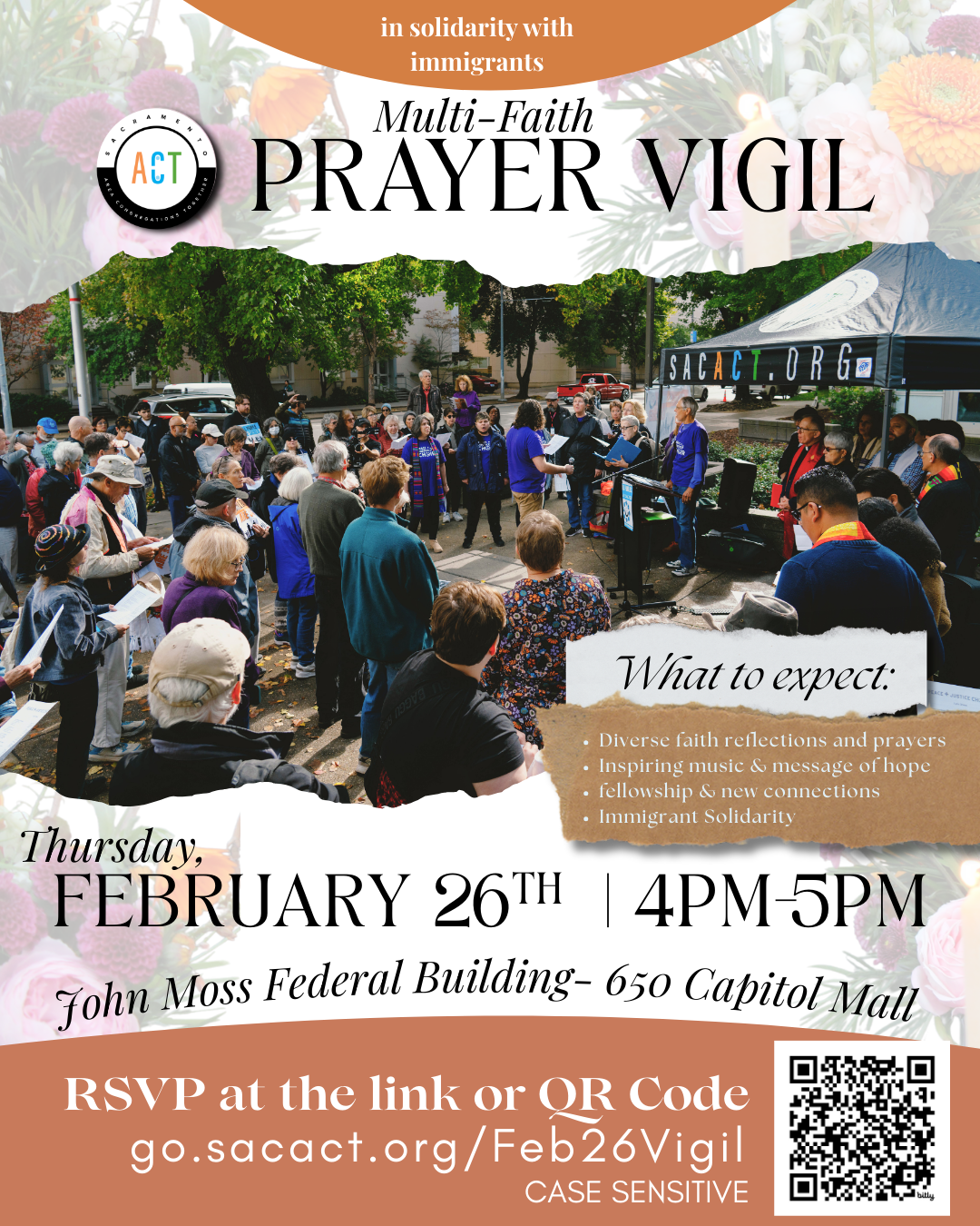 Dentro de una semana, los líderes religiosos y miembros de la comunidad de Sac ACT realizarán su tercera vigilia de oración. Esta vez, tendremos varios eventos previos a la vigilia. Se eligió la Parroquia de Nuestra Señora de Guadalupe en Sacramento para esta vigilia porque su nombre y su misión están profundamente entrelazados con el viaje de los migrantes y la búsqueda de santuario.