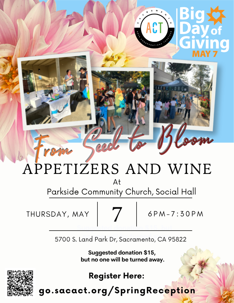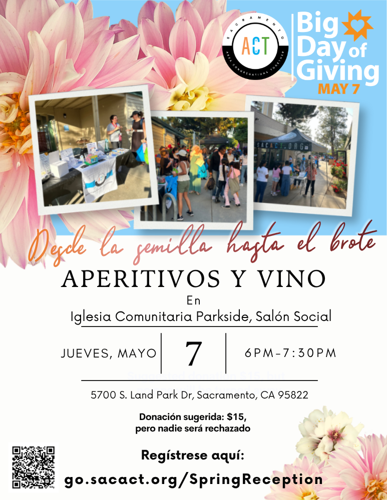 Celebra el Gran Día de las Donaciones y la temporada de primavera con nosotros. Te invitamos a nuestra primera recepción anual de primavera. Tendremos entrantes, dulces, té y vino. Daremos una actualización sobre nuestro trabajo, testimonios comunitarios y conversaremos.